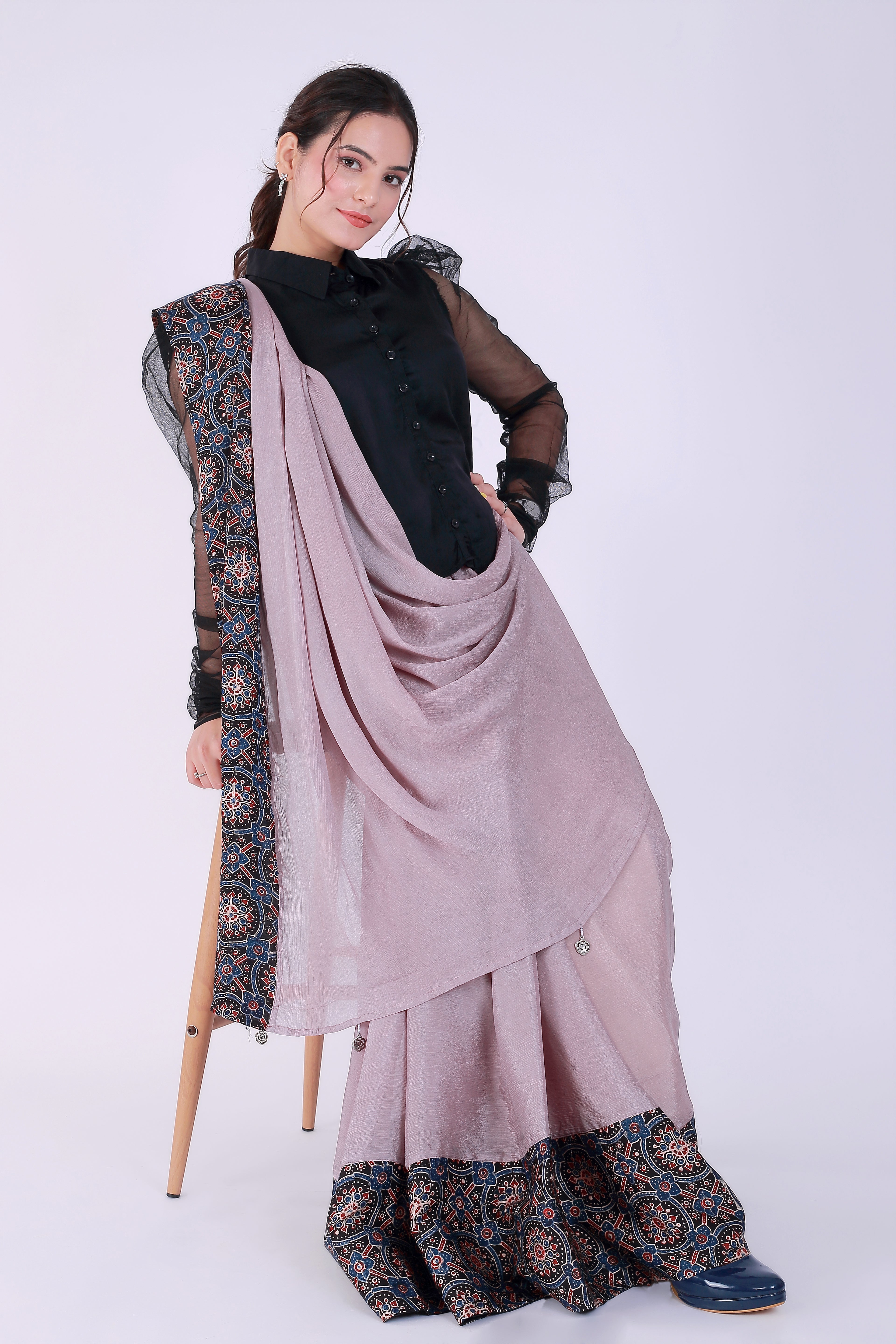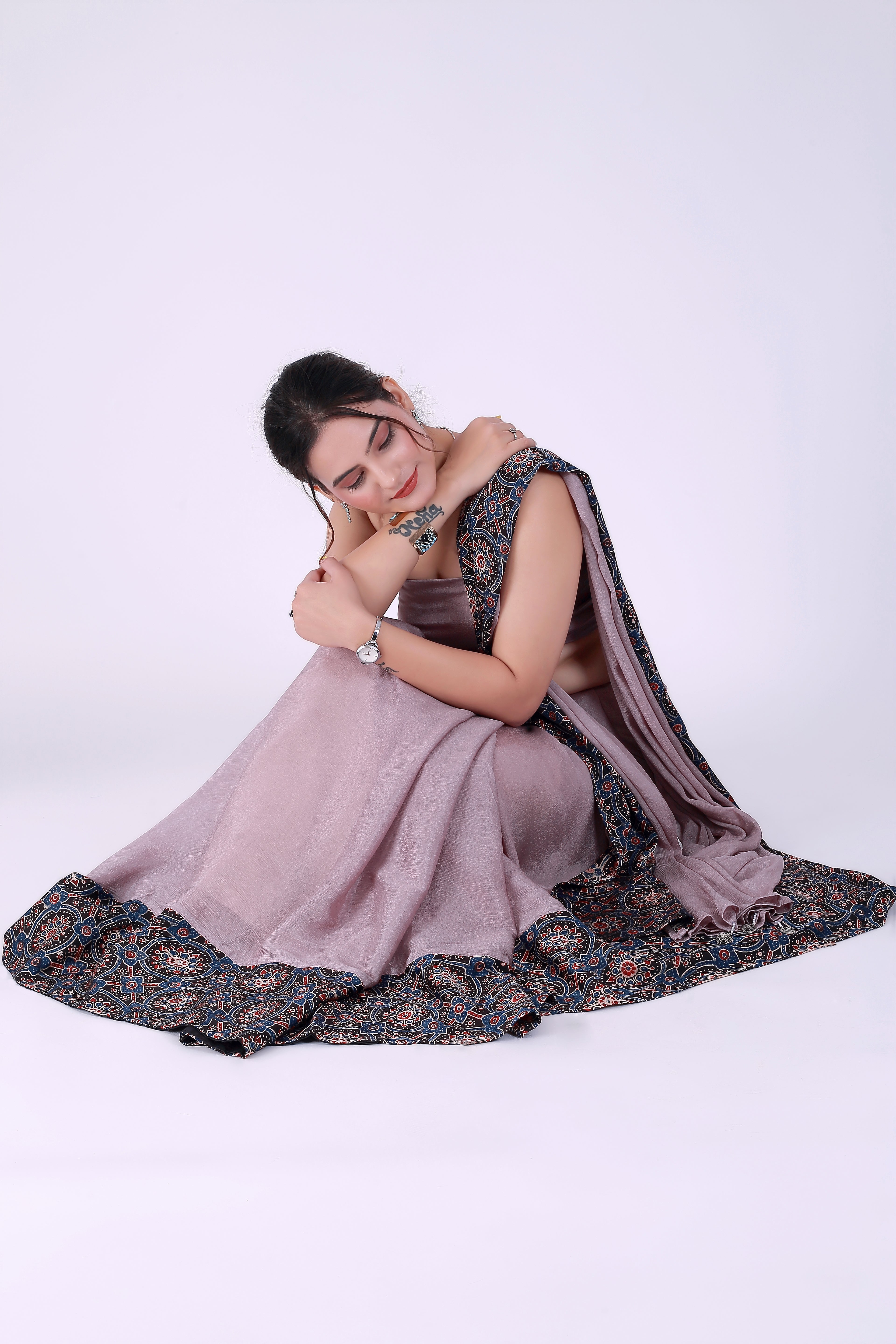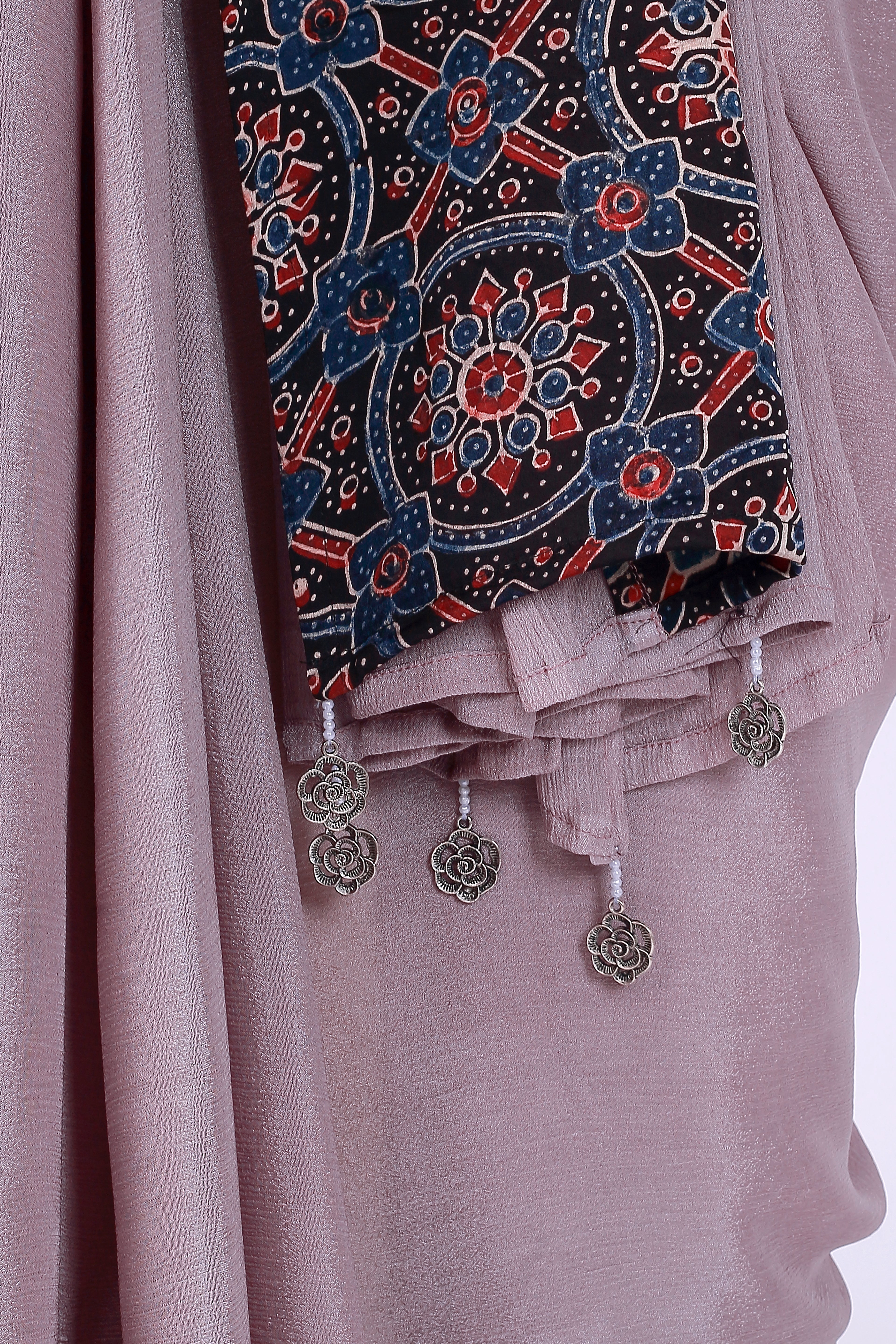 A unique onion pink color made from a blend of pure chiffon and modal fabric, hand-block printed using the Ajrakh... Read more