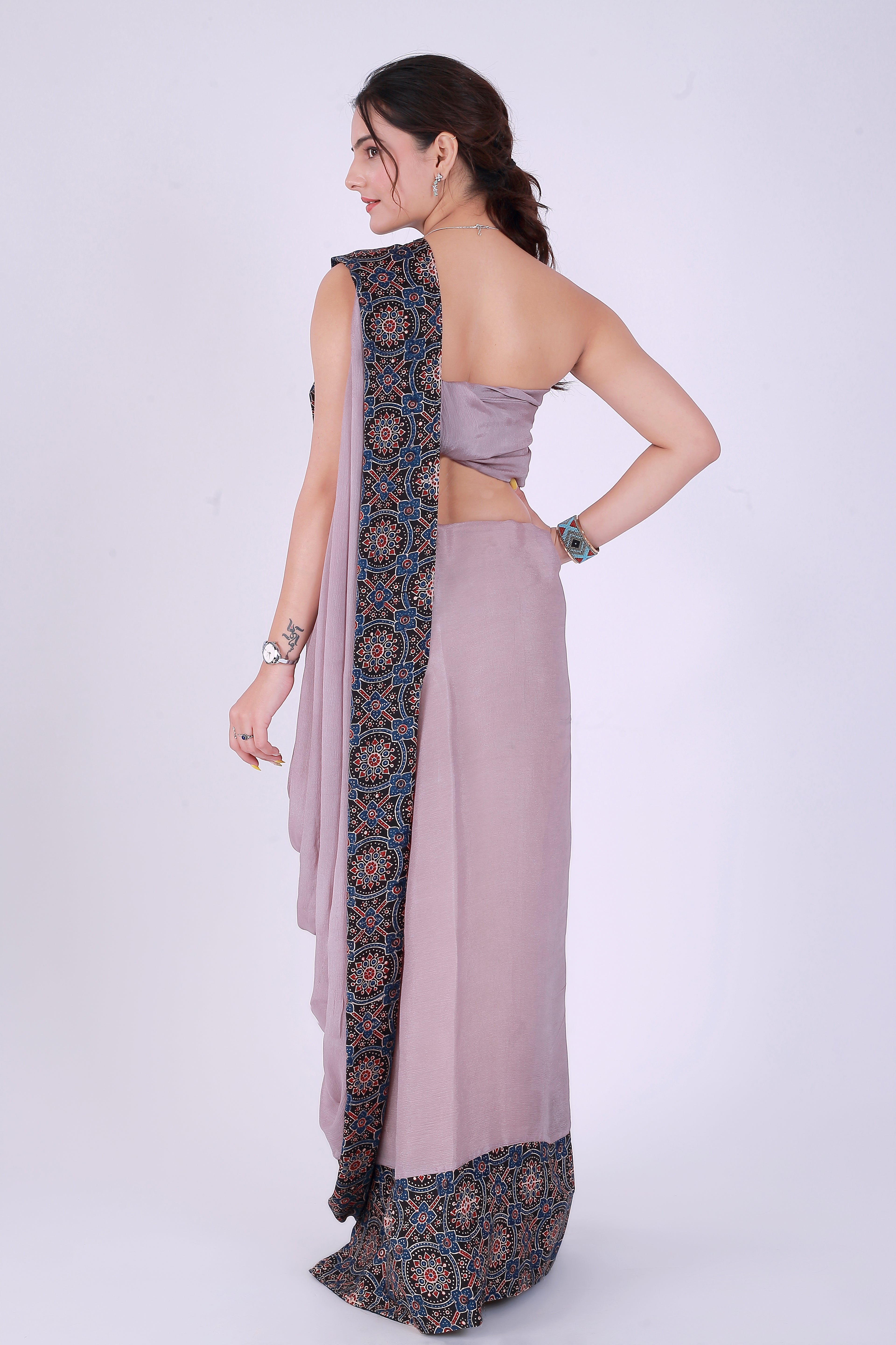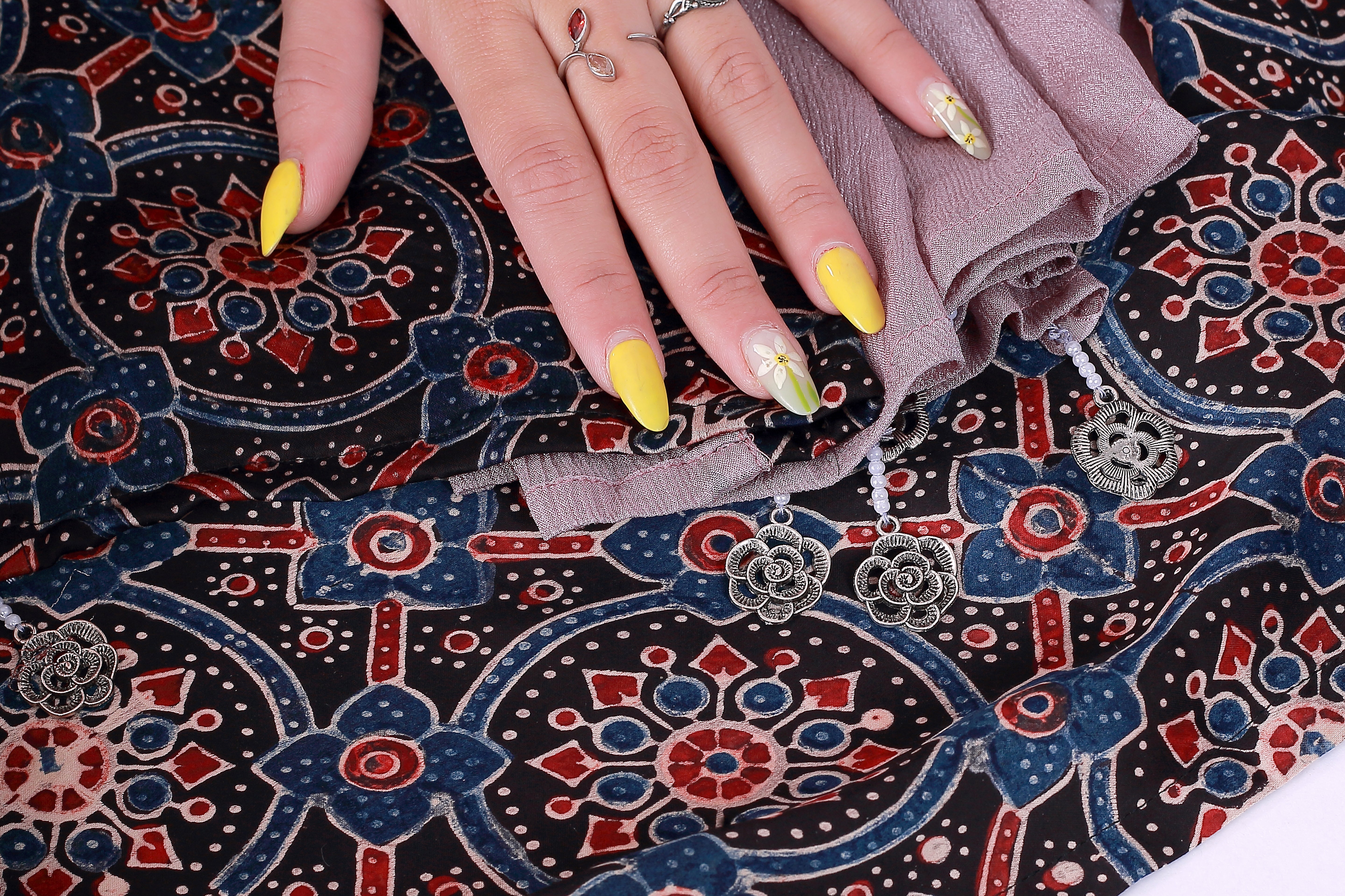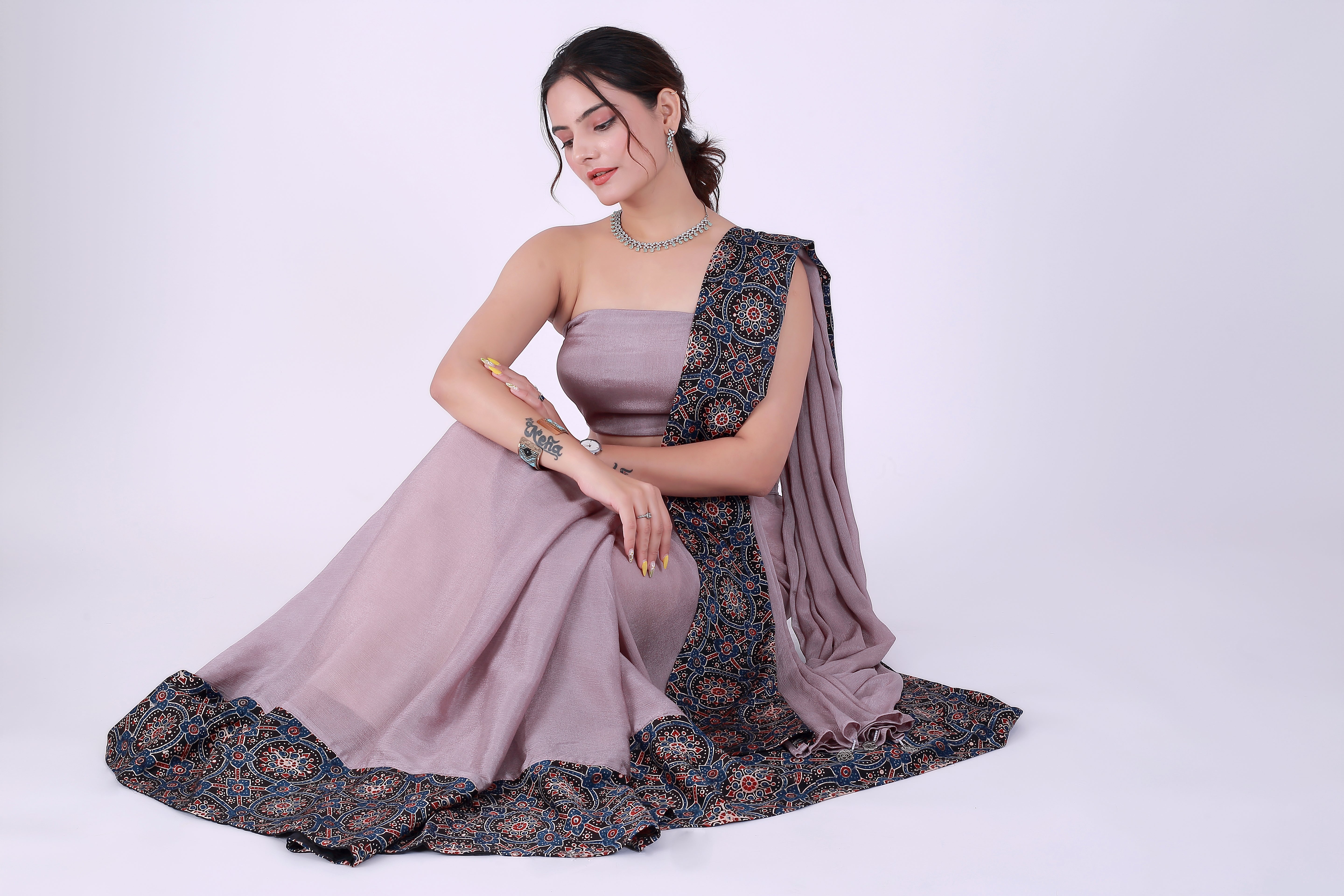 A unique onion pink color made from a blend of pure chiffon and modal fabric, hand-block printed using the Ajrakh... Read more