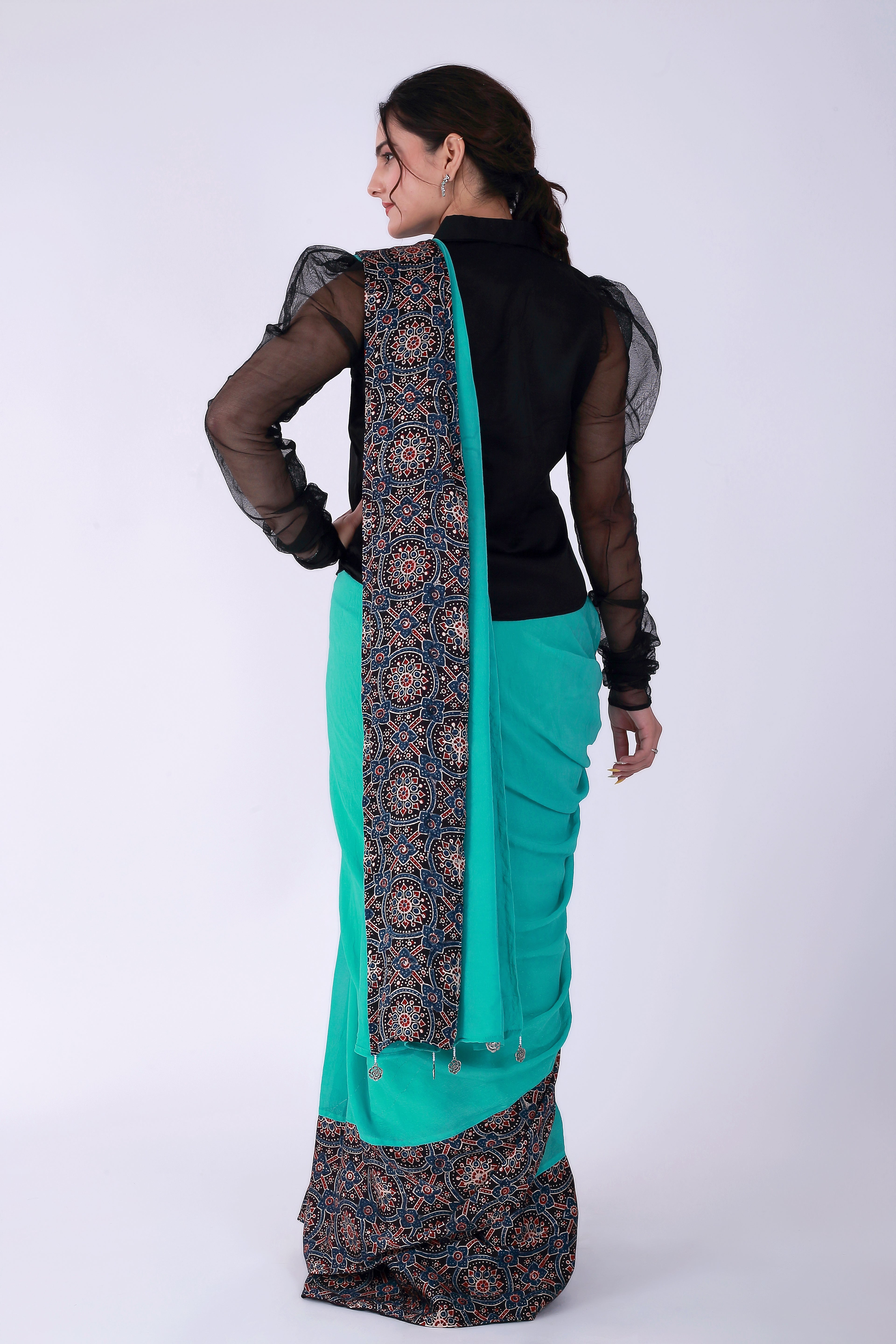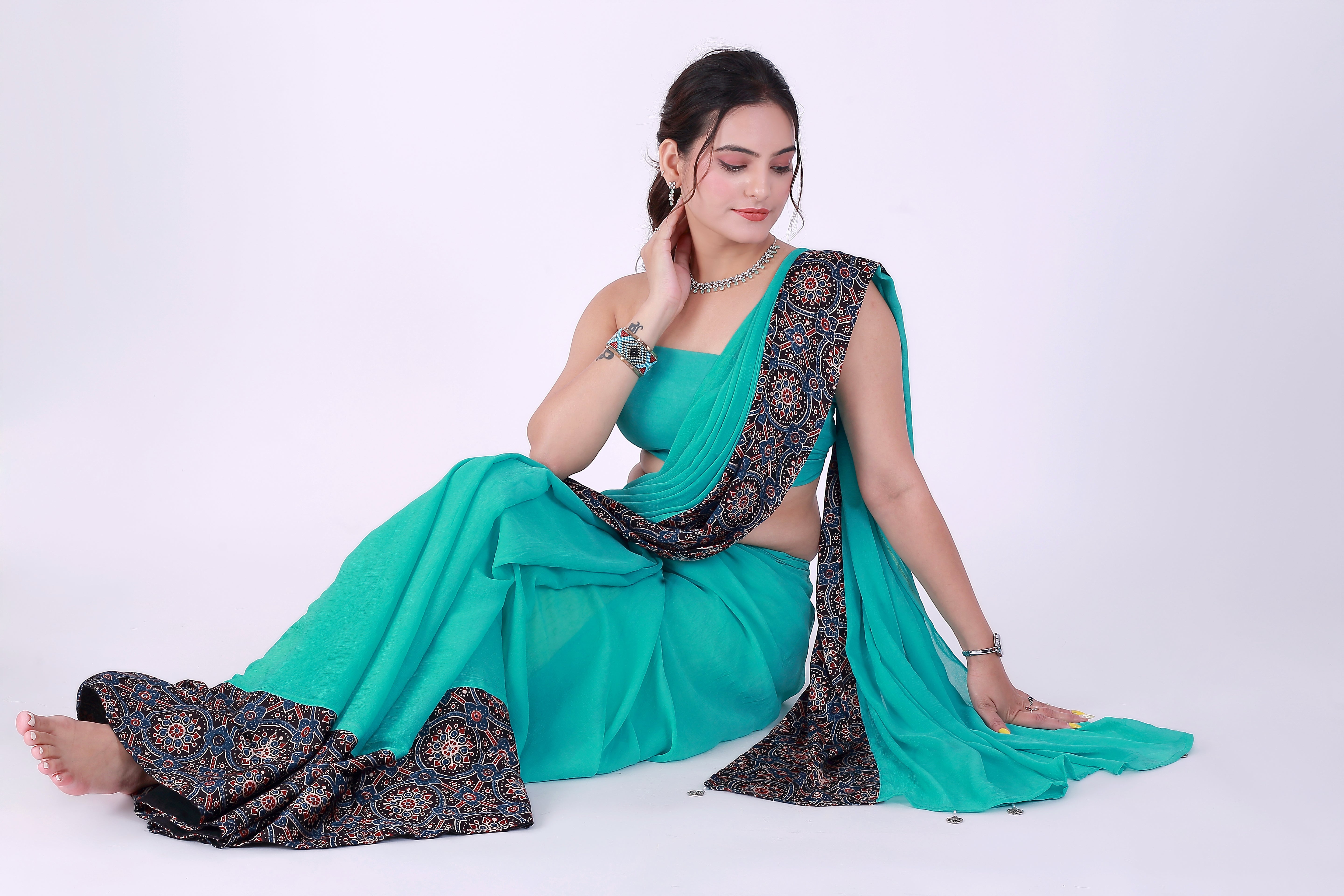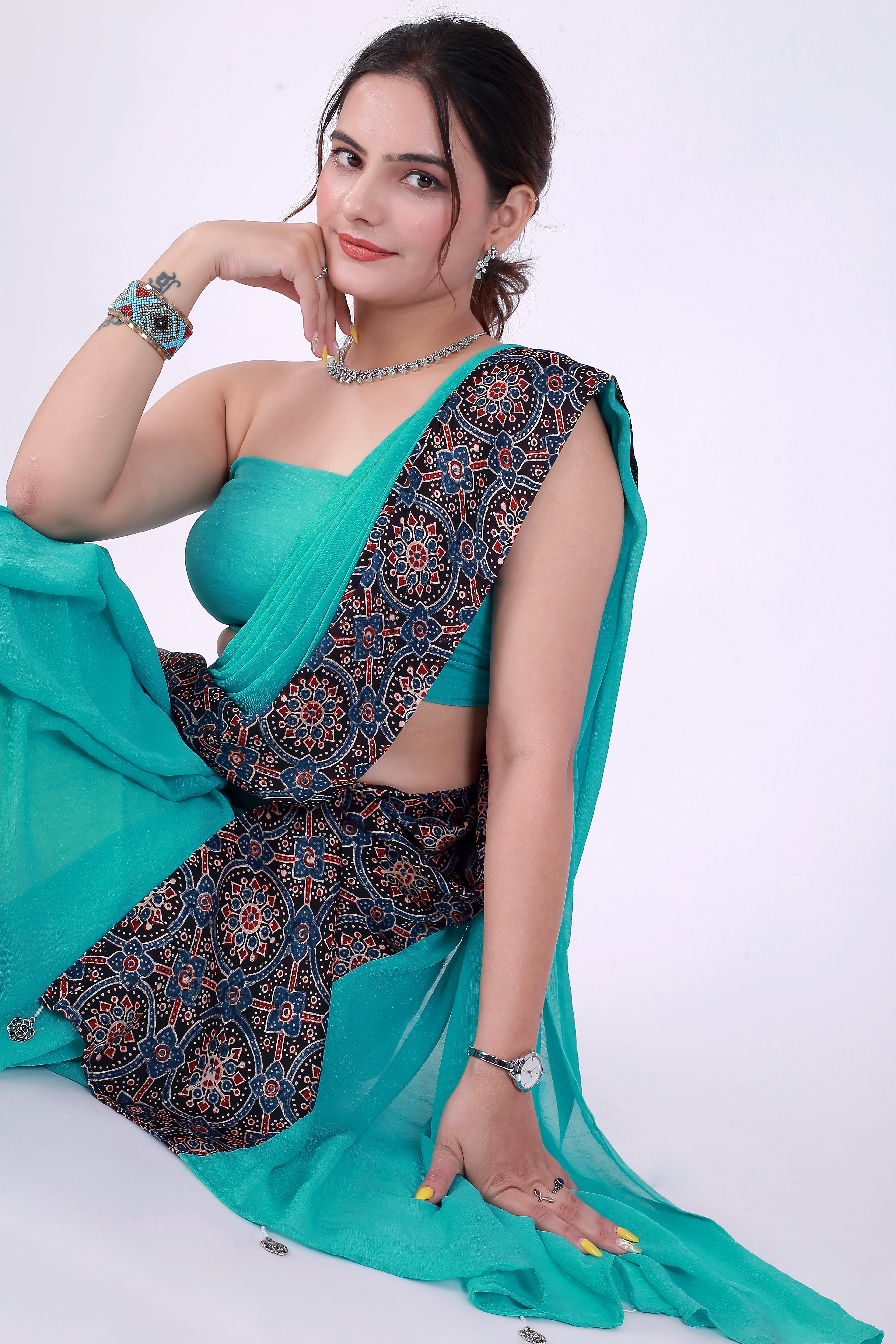 This saree is a pure chiffon and modal blend, crafted using the traditional Ajrakh hand-block printing technique. The deep teal... Read more