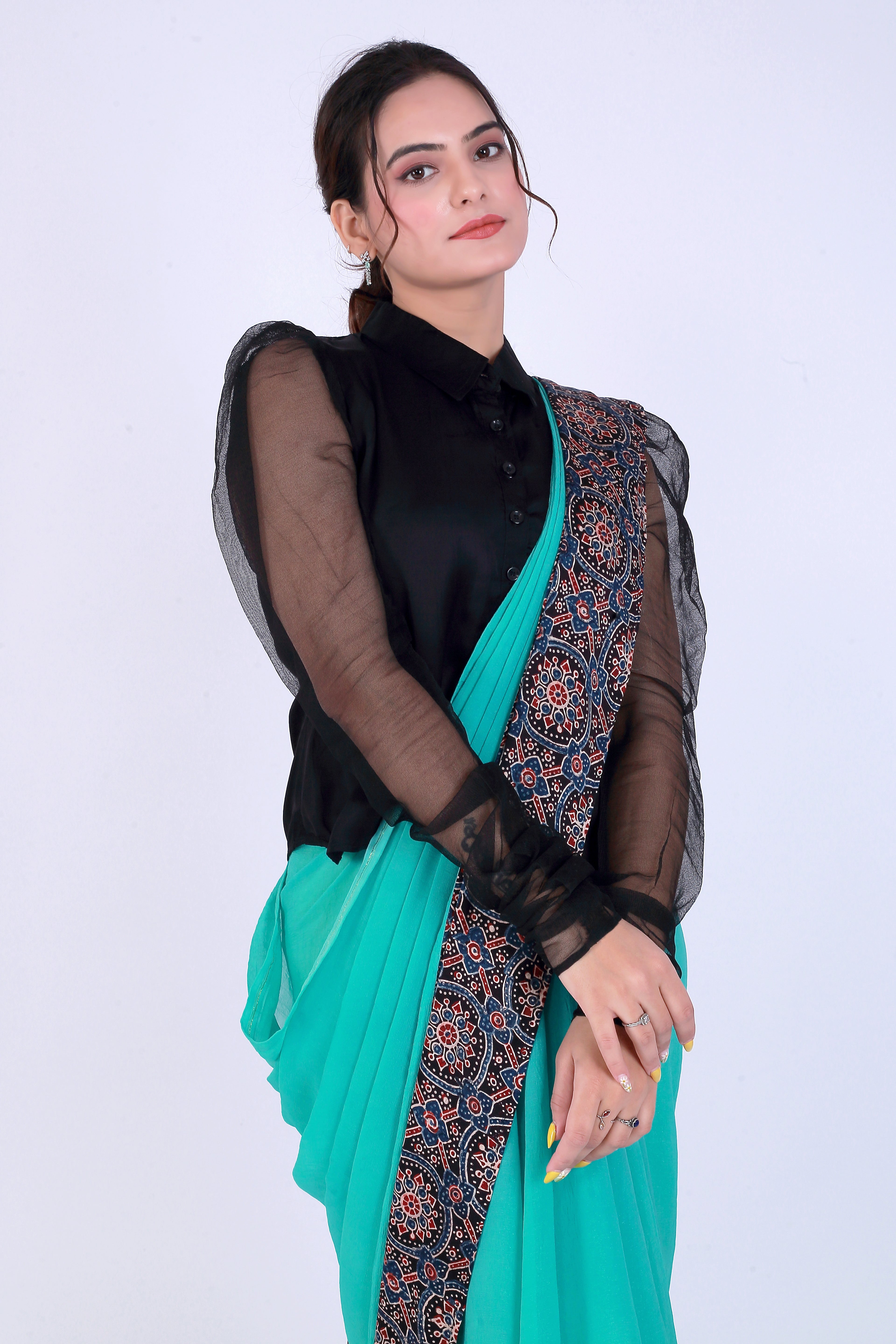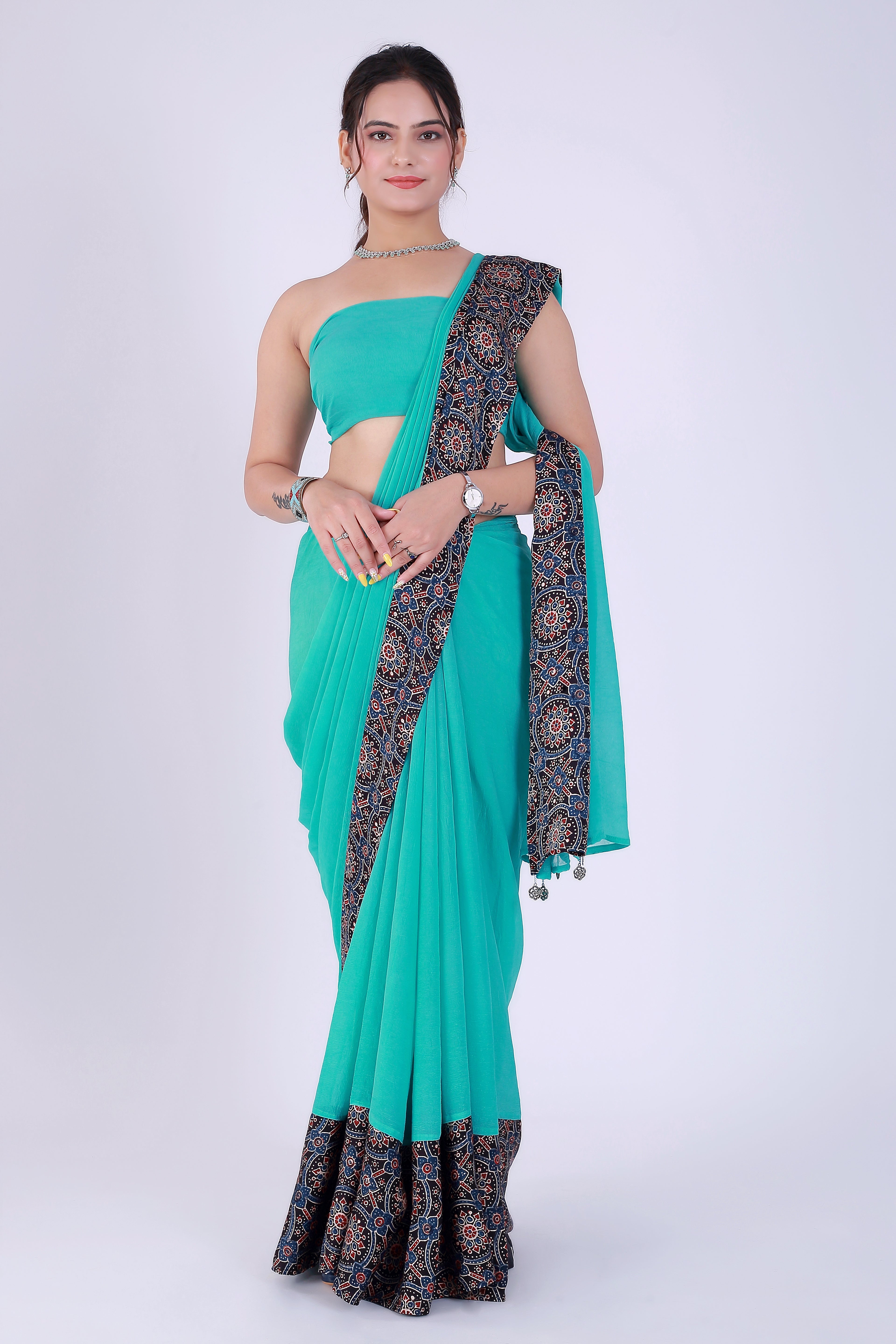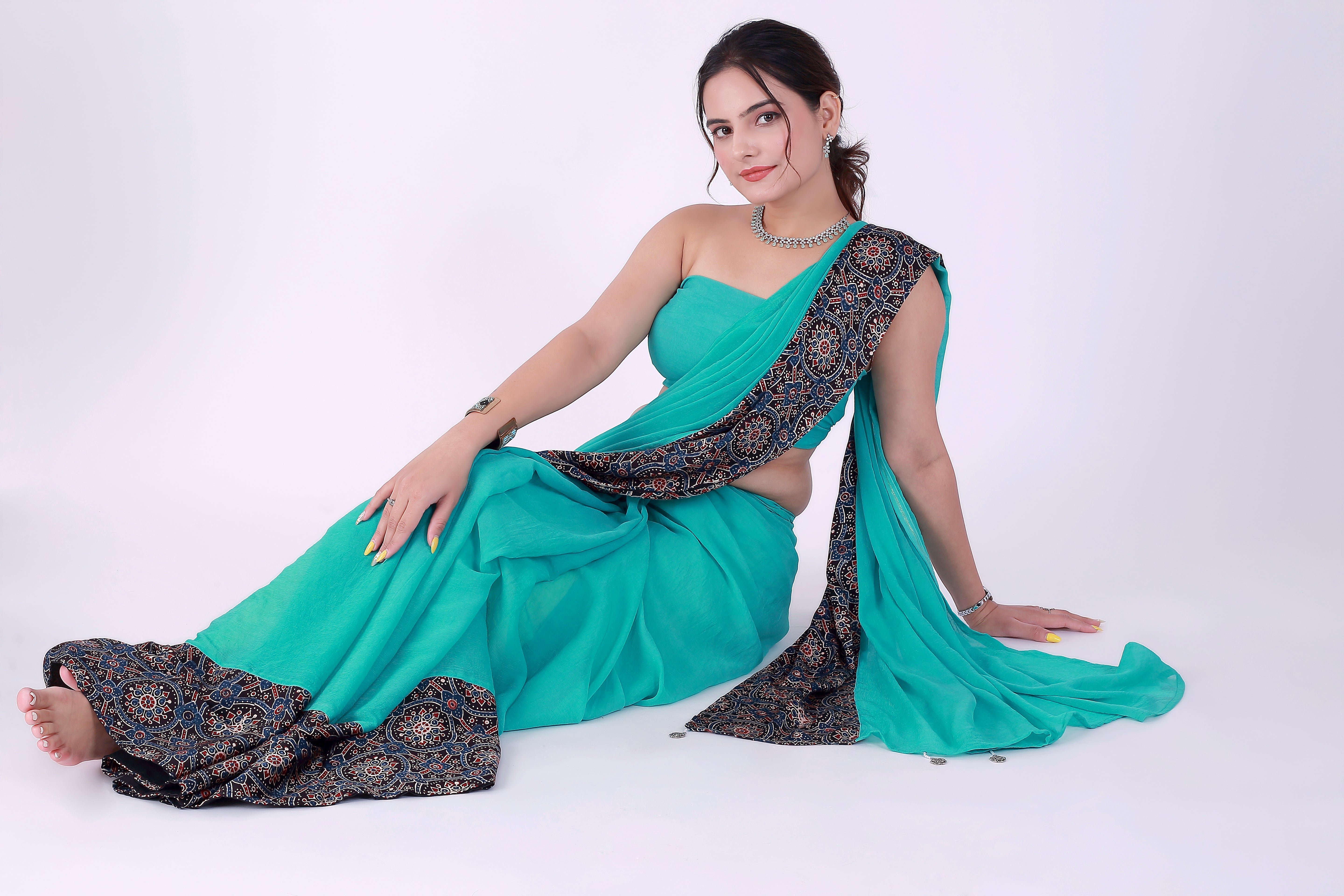 This saree is a pure chiffon and modal blend, crafted using the traditional Ajrakh hand-block printing technique. The deep teal... Read more
