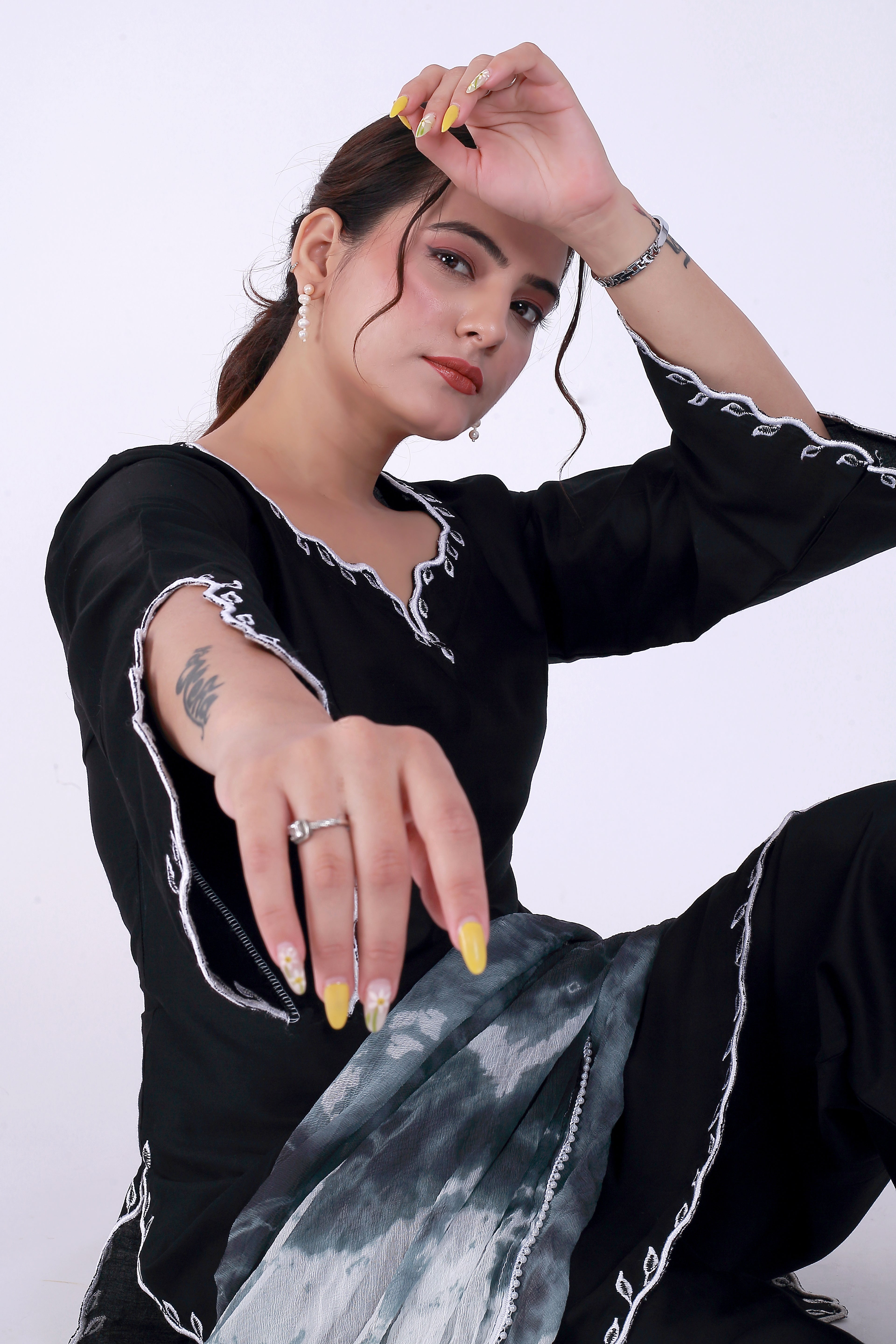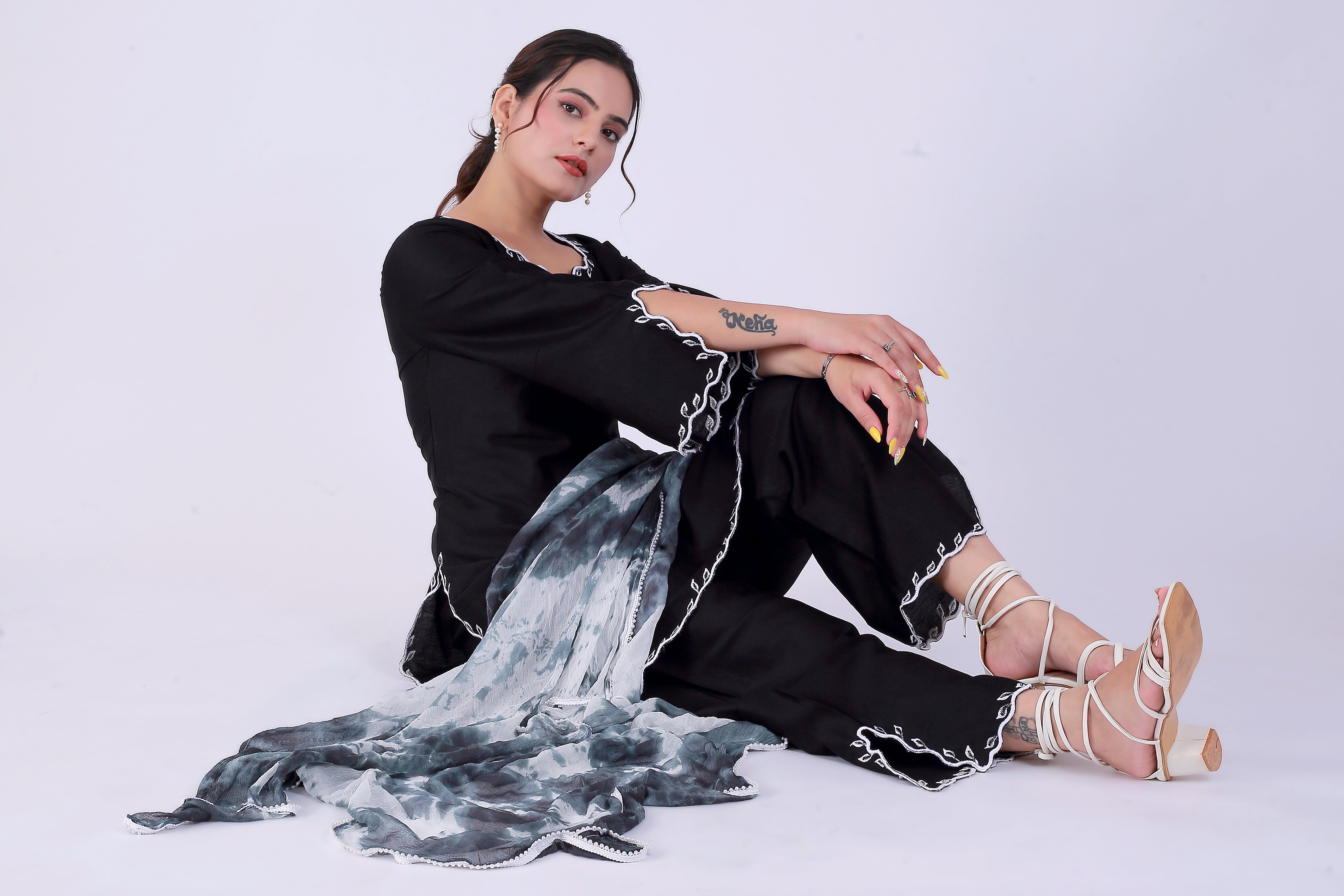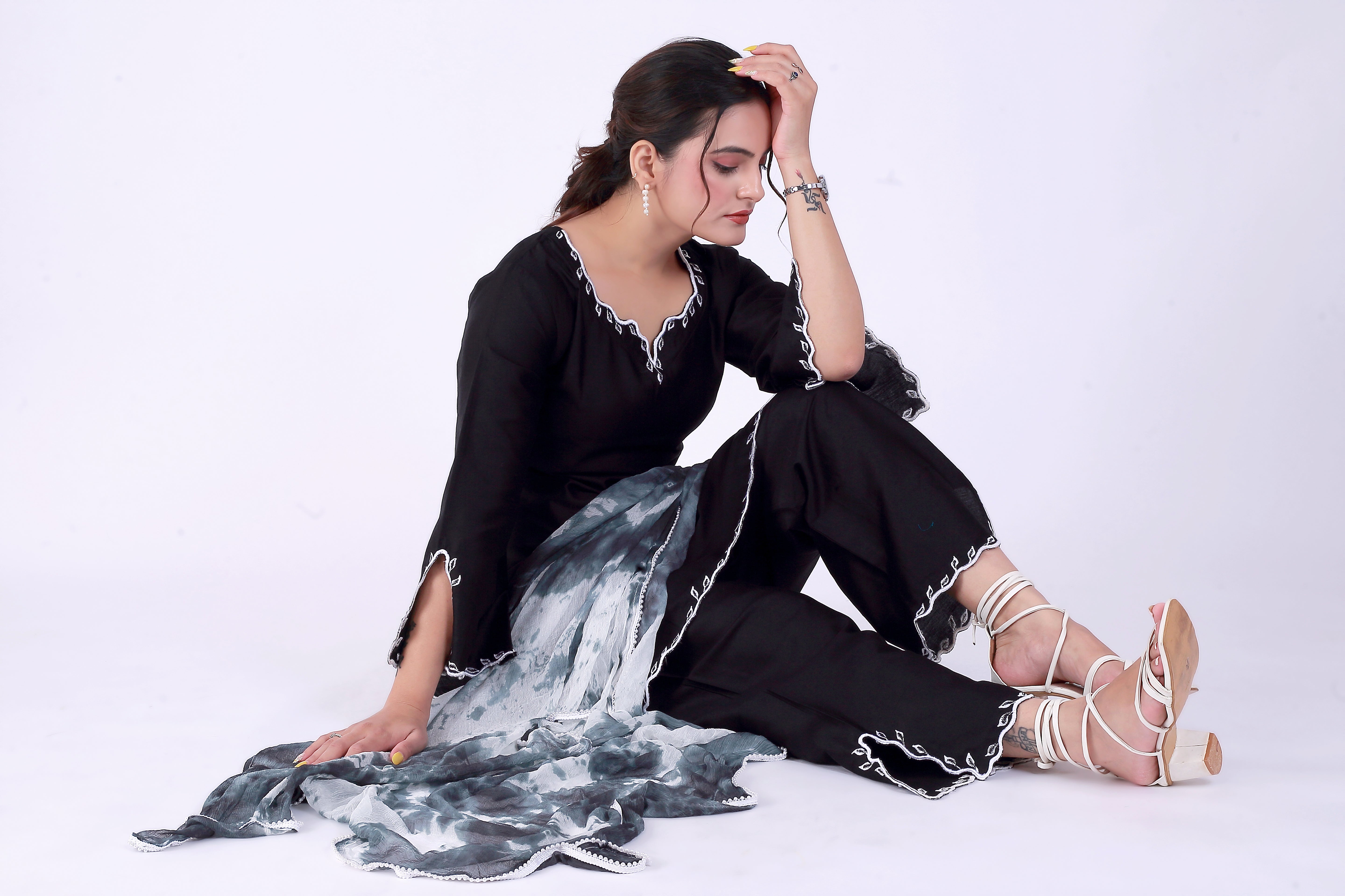 Add a touch of elegance to your ethnic wardrobe with Nirsha Bharat’s Black Tie-Dye Patti Suit Set. Crafted from soft,... Read more