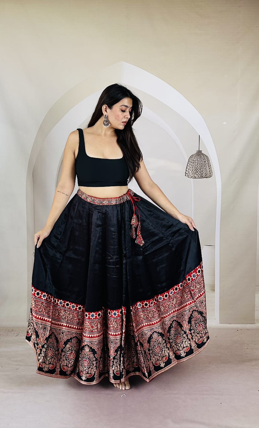 Pure Ajrakh Free-Size Mashru Silk Chaniya - Black