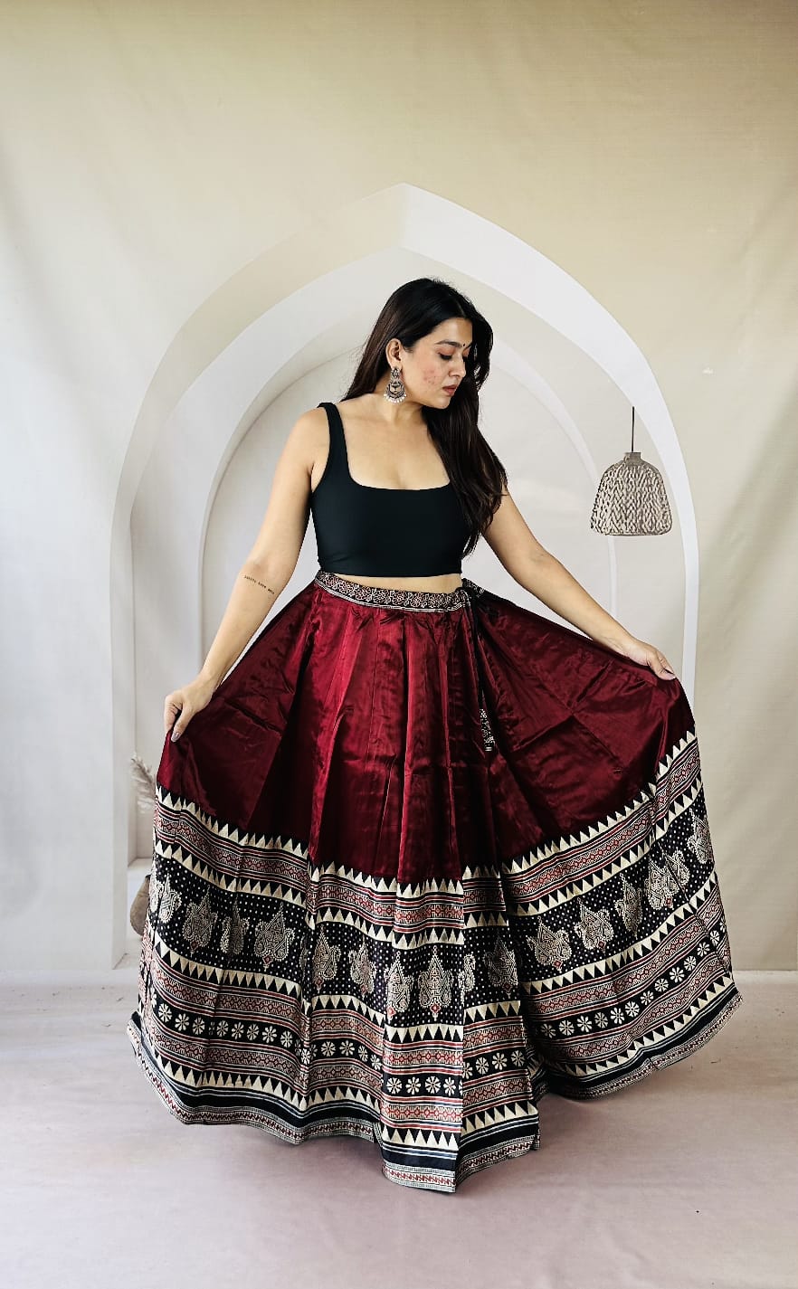 Pure Ajrakh Free-Size Mashru Silk Chaniya - Black & Red
