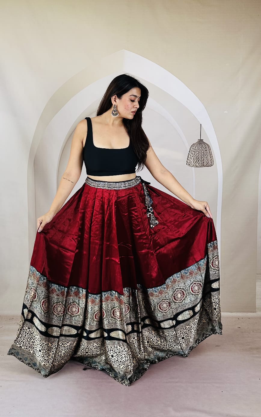 Pure Ajrakh Free-Size Mashru Silk Chaniya - Red & Black